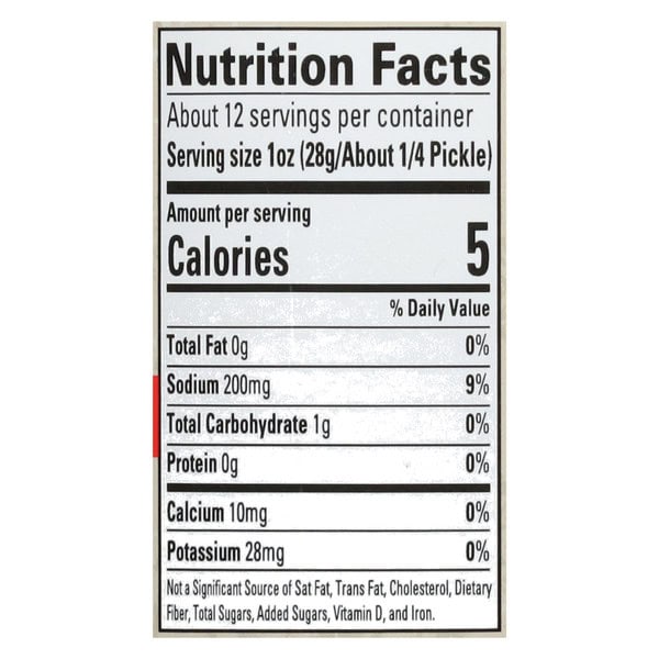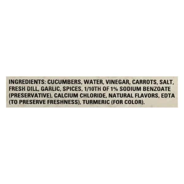 Cucumbers, Water, Vinegar, Salt, Garlic, Spices, 1/10 Of One Percent Sodium Benzoate (as A Preservative), Calcium Chloride, Natural Flavors, Edta (to Preserve Freshness), Turmeric (for Color).