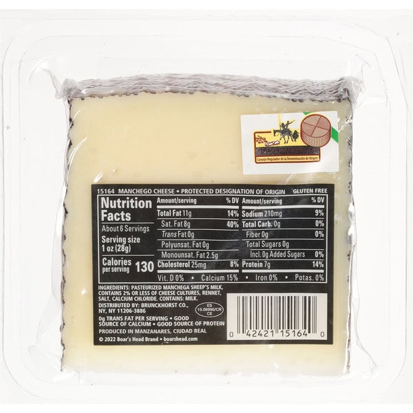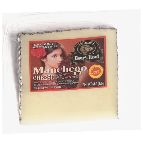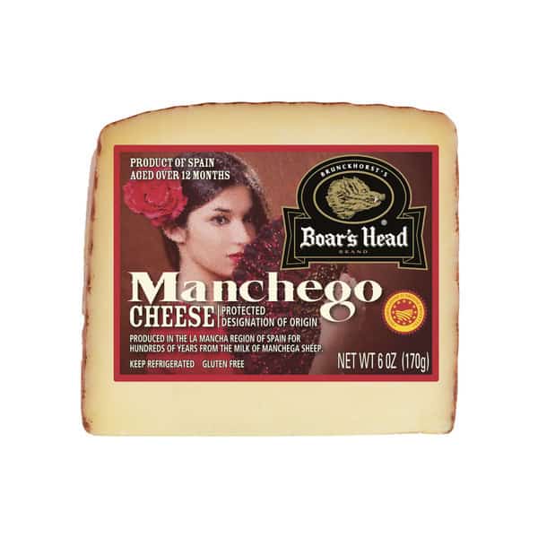 With a firm, slightly granular consistency and complex flavor that evokes Spain’s windswept La Mancha region, Boar’s Head® Manchego Cheese is a flavorful cheese that is crafted in the Old World style from sheep’s milk and aged 12 months.
