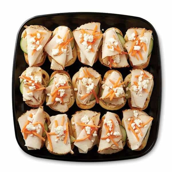 Miniature naan bread topped with Boars Head lemon pepper chicken, hummus, cucumber slices, shredded carrots, and feta cheese