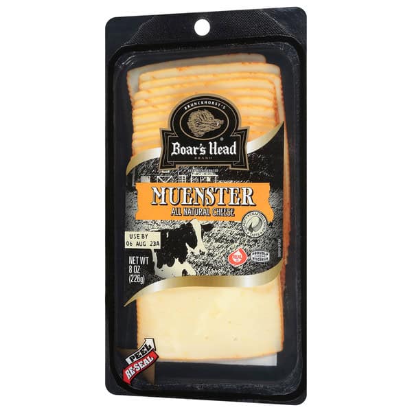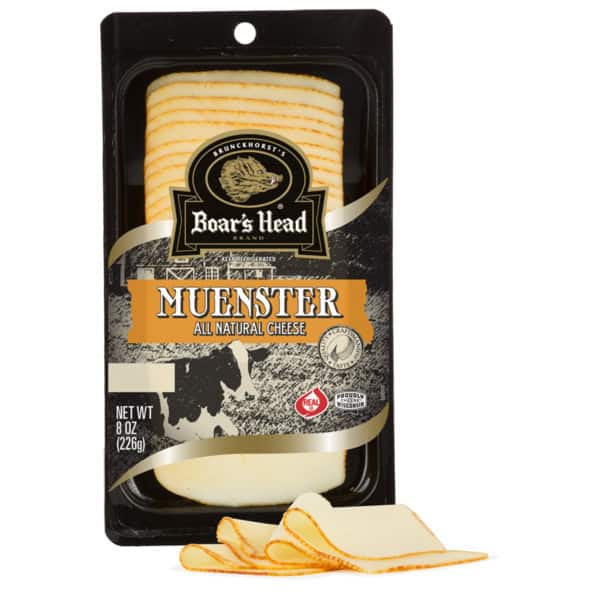 Handcrafted in the traditional style under the patient supervision of Master Cheesemakers and encased in a an edible natural Annatto colored rind. This creamy cheese has a smooth texture and mellow flavor. Boar’s Head® Muenster Cheese is made in Wisconsin with whole cow’s milk.