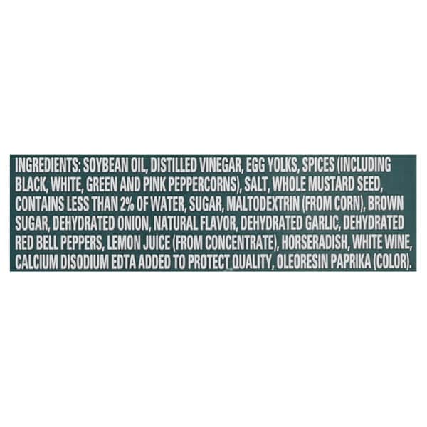 Soybean Oil, Distilled Vinegar, Egg Yolks, Spices (including Black, White, Green And Pink Peppercorns), Salt, Whole Mustard Seed, Contains Less Than 2% Of Water, Sugar, Maltodextrin (from Corn), Brown Sugar, Dehydrated Onion, Natural Flavor, Dehydrated Garlic, Dehydrated Red Bell Peppers, Lemon Juice (from Concentrate), Horseradish, White Wine, Calcium Disodium Edta Added To Protect Quality, Oleoresin Paprika (color)