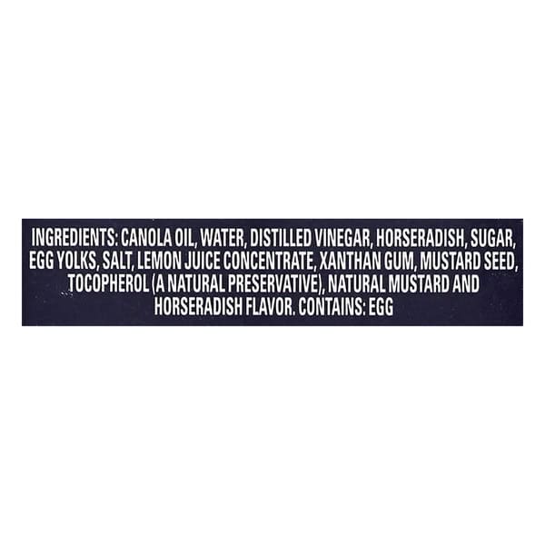 Canola Oil, Water, Horseradish, Vinegar, Sugar, Egg Yolks, Xanthan Gum, Lemon Juice, Salt, Ground Mustard Seeds, Tocopherol (a Natural Preservative).