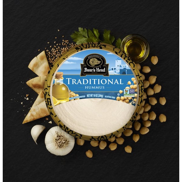 A Mediterranean-inspired treat, this creamy hummus blends chickpeas, sea salt, olive oil, tahini and a touch of garlic for a flavorful spread or snack. Boar’s Head® Traditional Hummus is gluten-free, non-GMO and 100% delicious.