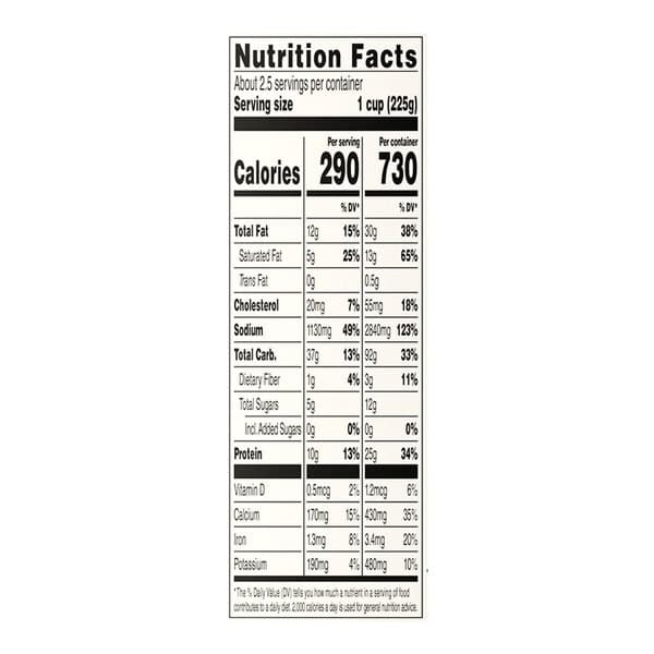 Cooking Instructions: Microwave (Time and temperature settings may vary due to differences in your particular stove or microwave. Always cook this product to 160 degrees F prior to serving): 1. Remove board overwrap. 2. Peel back corner or cut a small slit in film to vent. 3. Microwave on high power for 3 minutes. 4. Carefully remove from microwave, pull back film, and stir. 5. Continue cooking for an additional 1-1/2 to 2-1/2 minutes. 6. Carefully remove from microwave and stir. 7. Let product stand for 2 minutes prior to serving. Stove Top (Time and temperature settings may vary due to differences in your particular stove or microwave. Always cook this product to 160 degrees F prior to serving): 1. Remove board overwrap and film. 2. Empty contents of tray into sauce pan. 3. Place on stove over medium-low heat, stirring frequently until hot. 4. Carefully remove from cooktop and serve.