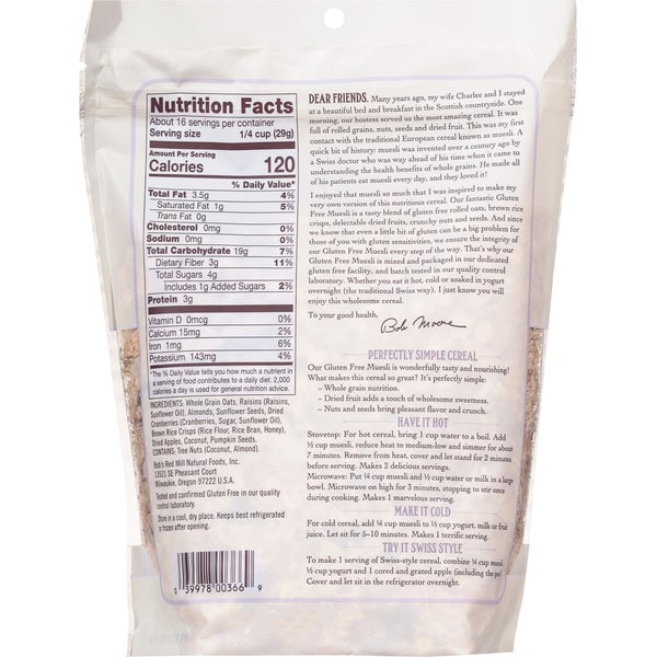 • GOOD MORNINGS START WITH GOOD INGREDIENTS: Bob’s Red Mill Gluten Free Muesli is a delightful mix of gluten free oats, nuts, seeds and dried fruit; inspired by the original Swiss muesli; enjoy it hot, cold or soaked overnight with yogurt for a nutritious start to your day