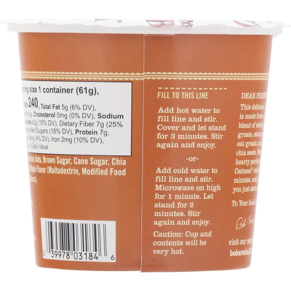 Enjoy the classic homemade taste of whole grain oatmeal with maple and brown sugar—no bowl required. This special blend of simple ingredients creates a hearty gluten and dairy free breakfast that can go wherever your day takes you: to work, the gym, outdoor adventures, and more! The addition of flax and chia seeds makes it even more nutritious and filling. Ready in 3 minutes: add hot water or heat in the microwave.