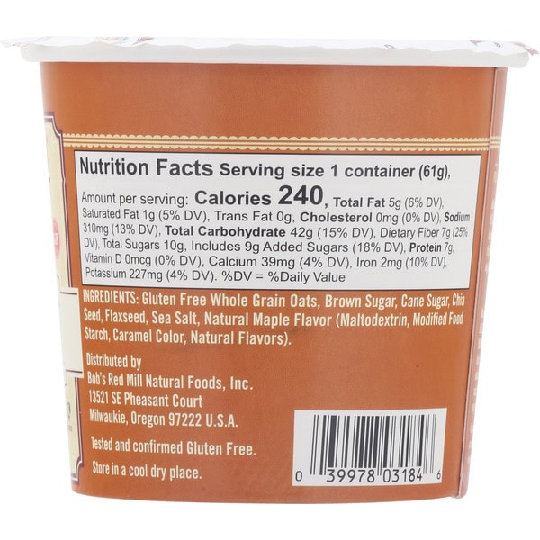 Gluten Free Whole Grain Oats, Brown Sugar, Cane Sugar, Chia Seed, Flaxseed, Sea Salt, Natural Maple Flavor (maltodextrin, Modified Food Starch, Caramel Color, Natural Flavors)