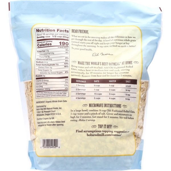 • GOOD MORNINGS START WITH GOOD INGREDIENTS: Bob’s Red Mill Organic Old Fashioned Rolled Oats make a tasty hot cereal that provides lasting energy to fuel your morning; perfect for classic oatmeal cookies, homemade granola and hearty oatmeal bread