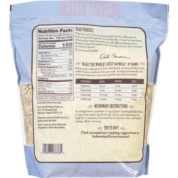 • GOOD MORNINGS START WITH GOOD INGREDIENTS: Bob’s Red Mill Gluten Free Quick Cooking Rolled Oats are the perfect solution for busy mornings; they’re steamed and rolled thin, for a hot, satisfying breakfast in just 5 minutes—without sacrificing flavor or nutrition