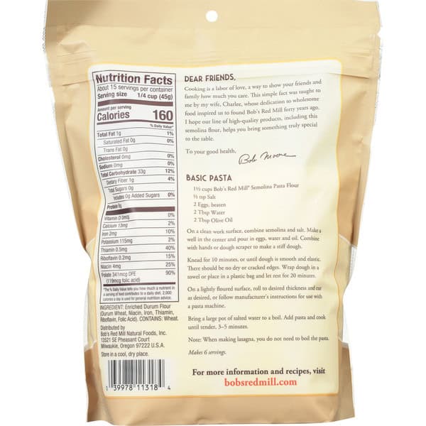 Semolina Flour is the essential ingredient for authentic homemade, Italian-style pasta. Its exceptionally high gluten content creates superior pasta that keeps its shape during cooking. Also great for baked goods and pudding.