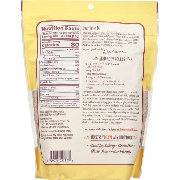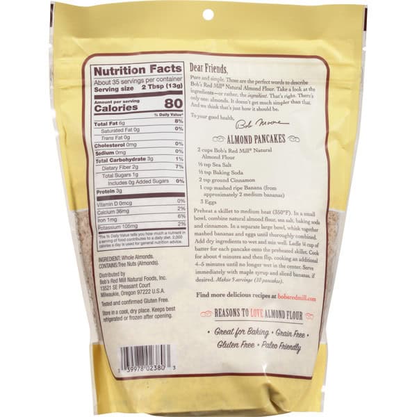 Share good ingredients for all! Bob’s Red Mill Natural Almond Flour is made from premium whole California-grown almonds, finely ground to create a superior gluten free, low-carb flour. Perfect for paleo, keto and grain free baking, it adds a rich, buttery flavor and moist texture to your favorite recipes. Use as a breading for meats and vegetables or to replace breadcrumbs in meatballs. Expertly milled for homemade perfection—every time—this premium gluten free flour is the ideal ingredient to share with loved ones with celiac or a gluten intolerance.