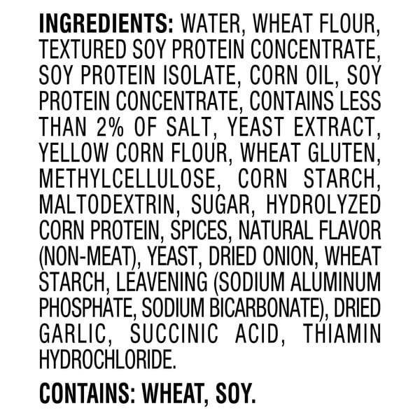 Water, Wheat Flour, Textured Soy Protein Concentrate, Soy Protein Isolate, Corn Oil, Soy Protein Concentrate, Contains Less Than 2% Of Salt, Yeast Extract, Yellow Corn Flour, Wheat Gluten, Methylcellulose, Corn Starch, Maltodextrin, Sugar, Hydrolyzed Corn Protein, Spices, Natural Flavor (non-meat), Yeast, Dried Onion, Wheat Starch, Leavening (sodium Aluminum Phosphate, Sodium Bicarbonate), Dried Garlic, Succinic Acid, Thiamin Hydrochloride