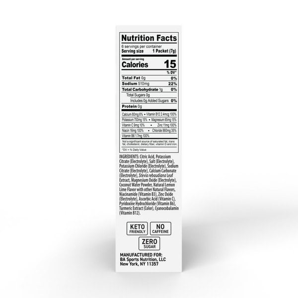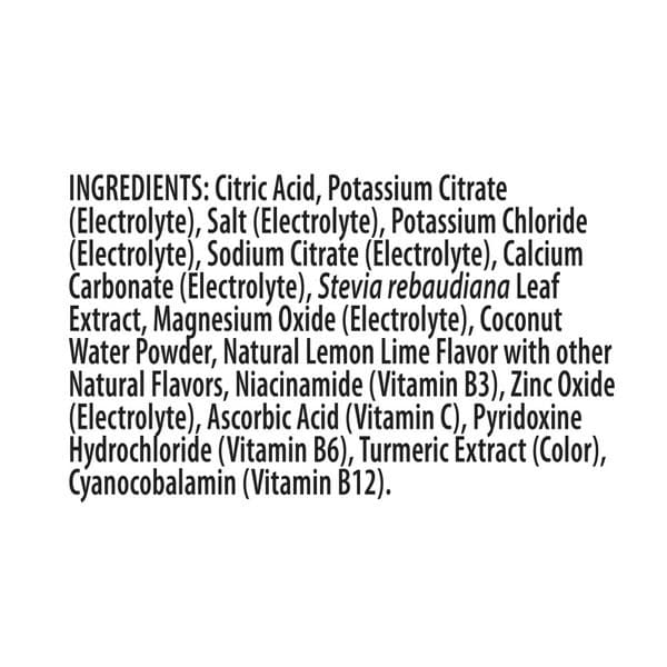 Citric Acid, Potassium Citrate (electrolyte), Salt (electrolyte), Potassium Chloride (electrolyte), Sodium Citrate (electrolyte), Calcium Carbonate (electrolyte), Stevia Rebaudiana Leaf Extract, Magnesium Oxide (electrolyte), Coconut Water Powder, Natural Lemon Lime Flavor With Other Natural Flavors, Niacinamide (vitamin B3), Zinc Oxide (electrolyte), Ascorbic Acid (vitamin C), Pyridoxine Hydrochloride (vitamin B6), Turmeric Extract (color), Cyanocobalamin (vitamin B12)