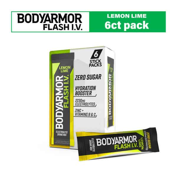 • 6 pack, 0.25 dry oz BODYARMOR Flash I.V. Lemon Lime hydration powder sticks