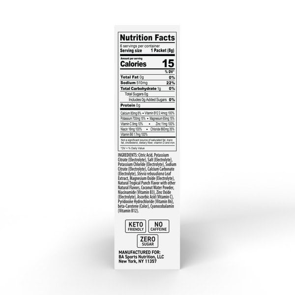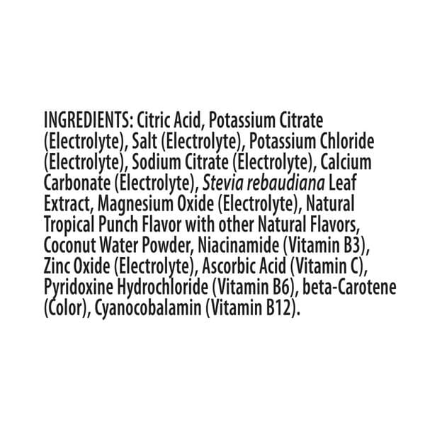 Citric Acid, Potassium Citrate (electrolyte), Salt (electrolyte), Potassium Chloride (electrolyte), Sodium Citrate (electrolyte), Calcium Carbonate (electrolyte), Stevia Rebaudiana Leaf Extract, Magnesium Oxide (electrolyte), Natural Tropical Punch Flavor With Other Natural Flavors, Coconut Water Powder, Niacinamide (vitamin B3), Zinc Oxide (electrolyte), Ascorbic Acid (vitamin C), Pyridoxine Hydrochloride (vitamin B6), Beta-carotene (color), Cyanocobalamin (vitamin B12)