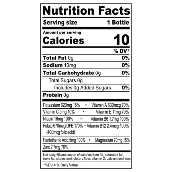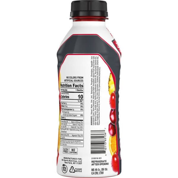 Filtered Water, Citric Acid, Dipotassium Phosphate (electrolyte), Vegetable Juice Concentrate (color), Stevia Sweetener, Magnesium Oxide (electrolyte), Natural Fruit Punch Flavor With Other Natural Flavors, Ascorbic Acid, Calcium D-pantothenate (vitamin B5), Niacinamide (vitamin B3), Alpha-tocopheryl Acetate (vitamin E), Zinc Oxide (electrolyte), Pyridoxine Hydrochloride (vitamin B6), Vitamin A Palmitate (vitamin A), Folic Acid (vitamin B9), Cyanocobalamin (vitamin B12)