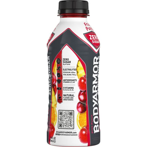 • 16 fl oz bottle of BODYARMOR Zero Sugar Fruit Punch electrolyte drink to refresh your relentless drive all day, every day