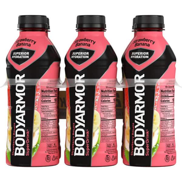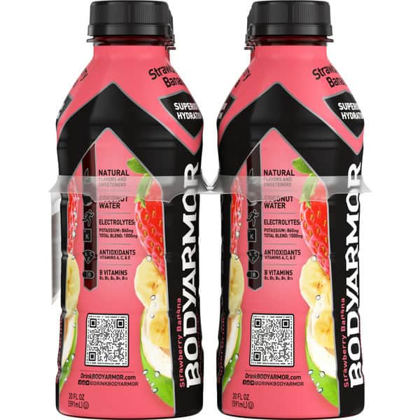 • 6 pack, 20 fl oz bottles of BODYARMOR Sports Drink Strawberry Banana — hydration’s MVP