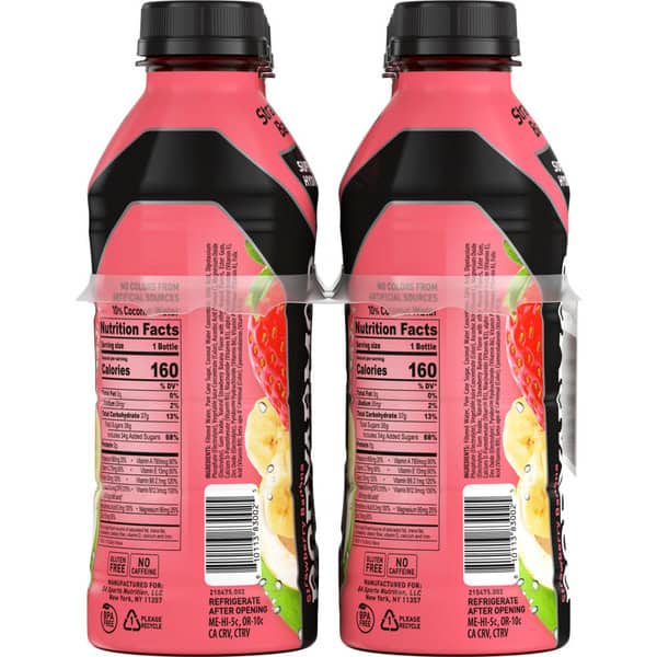 Filtered Water, Pure Cane Sugar, Coconut Water Concentrate, Citric Acid, Dipotassium Phosphate (electrolyte), Vegetable Juice Concentrate (color), Ascorbic Acid (vitamin C), Magnesium Oxide (electrolyte), Gum Arabic, Natural Strawberry Banana Flavor With Other Natural Flavors, Niacinamide (vitamin B3), Calcium D-pantothenate (vitamin B5), Ester Gum, Alpha-tocopheryl Acetate (vitamin E), Zinc Oxide (electrolyte), Pyridoxine Hydrochloride (vitamin B6), Folic Acid (vitamin B9), Vitamin A Palmitate (vitamin A), Beta-apo-8′ Carotenal (color), Cyanocobalamin (vitamin B12)