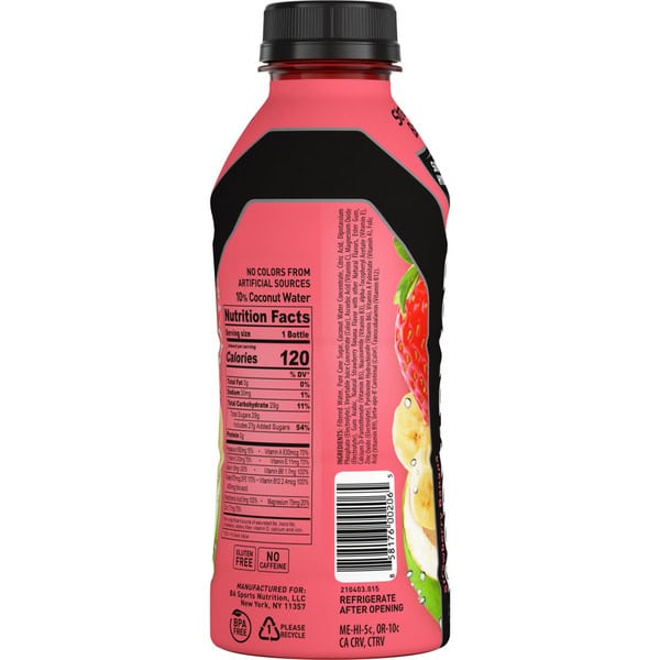 Filtered Water, Pure Cane Sugar, Coconut Water Concentrate, Citric Acid, Dipotassium Phosphate (electrolyte), Vegetable Juice Concentrate (color), Ascorbic Acid (vitamin C), Magnesium Oxide (electrolyte), Gum Arabic, Natural Strawberry Banana Flavor With Other Natural Flavors, Niacinamide (vitamin B3), Calcium D-pantothenate (vitamin B5), Ester Gum, Alpha-tocopheryl Acetate (vitamin E), Zinc Oxide (electrolyte), Pyridoxine Hydrochloride (vitamin B6), Folic Acid (vitamin B9), Vitamin A Palmitate (vitamin A), Beta-apo-8 Carotenal (color), Cyanocobalamin (vitamin B12)