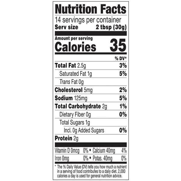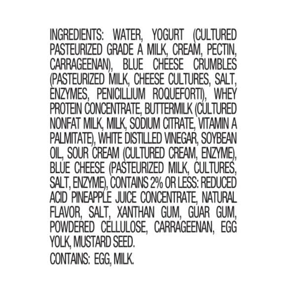 Water, Yogurt Cultured Pasteurized Grade A Milk, Cream, Pectin, Carrageenan), Blue Cheese Crumbles (pasteurized Milk, Cheese Cultures, Salt, Énzymes, Penicillium Roqueforti), Whey Protein Concentrate, Buttermilk (cultured Nonfat Milk, Milk, Sodium Citrate, Vitamin A Palmitate), White Distilled Vinegar, Soybean Oil, Sour Cream (cultured Cream, Enzyme), Blue Cheese (pasteurized Milk, Cultures, Salt, Enzyme), Contains 2% Or Less: Reduced Acid Pineapple Juice Concentrate, Natural Flavor, Salt, Xanthan Gum, Guar Gum, Powdered Cellulose, Carrageenan, Egg Yolk, Mustard Seed.