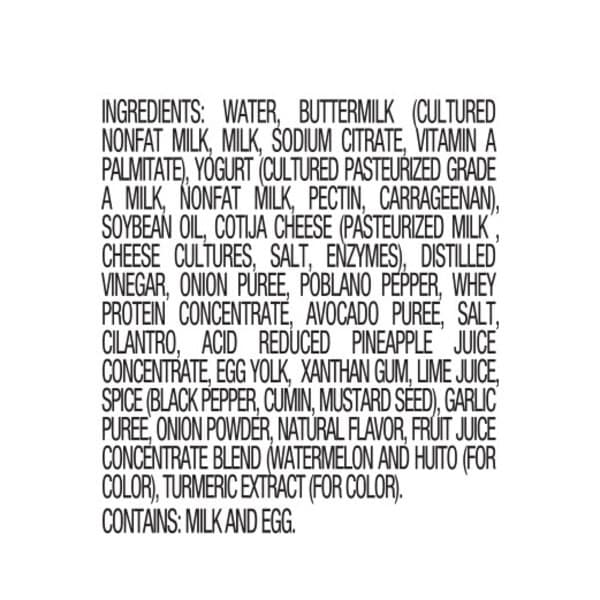 Water, Buttermilk (cultured Nonfat Milk, Milk, Sodium Citrate, Vitamin A Palmitate), Yogurt (cultured Pasteurized Grade A Milk, Nonfat Milk, Pectin, Carrageenan), Soybean Oil, Cotija Cheese (pasteurized Milk , Cheese Cultures, Salt, Enzymes), Distilled Vinegar, Onion Puree, Poblano Pepper, Whey Protein Concentrate, Avocado Puree, Salt, Cilantro, Acid Reduced Pineapple Juice Concentrate, Egg Yolk, Xanthan Gum, Lime Juice, Spice (black Pepper, Cumin, Mustard Seed), Garlic Puree, Onion Powder, Natural Flavor, Fruit Juice Concentrate Blend (watermelon And Huito (for Color), Turmeric Extract (for Color).