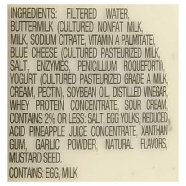 Filtered Water, Buttermilk (cultured Nonfat Milk, Milk, Sodium Citrate, Vitamin A Palmitate), Blue Cheese (cultured Pasteurized Milk, Salt, Enzymes, Penicillium Roquefortii), Yogurt (cultured Pasteurized Milk, Cream, Pectin, Carrageenan), White Grape Juice From Concentrate (filtered Water, White Grape Juice Concentrate), Soybean Oil, White Distilled Vinegar, Whey Protein Concentrate, Sour Cream, Contains 2% Or Less: Egg Yolks, Mustard Seed, Salt, Xanthan Gum, Garlic, Natural Flavors.