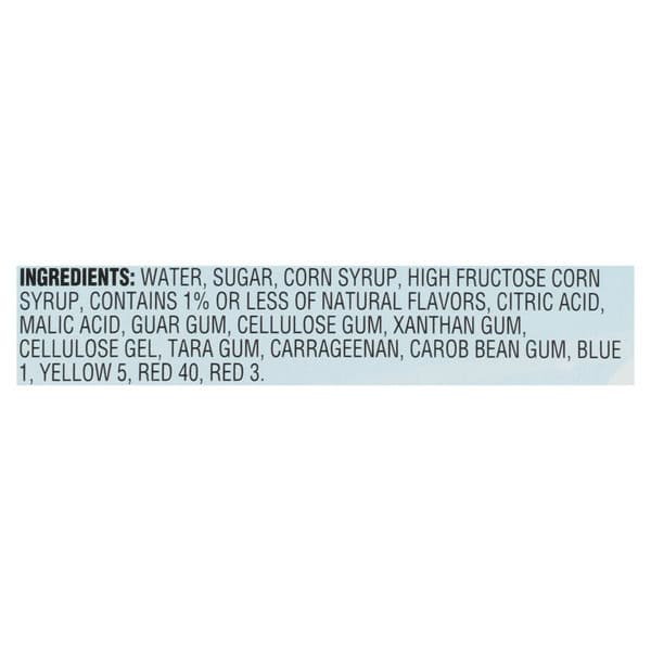 Water, Sugar, Corn Syrup, High Fructose Corn Syrup, Contains 1% Or Less Of Natural Flavors, Guar Gum, Cellulose Gum, Xanthan Gum, Citric Acid, Malic Acid, Blue 1, Yellow 5, Red 40, Red 3