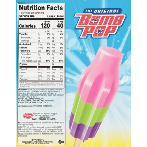 Your favorite frozen treat, meet your favorite candy. Introducing Bomb Pop NERDS Ice Pop! Experience the mash-up of classic NERDS candy flavors including tart strawberry, sweet watermelon, and tangy grape all on one stick. Talk about an epic collab! This frozen treat is presented in the iconic Bomb Pop rocket shape, with the soft-bite texture you know and love. Perfect as a refreshing sweet treat on a hot day or as a tasty reminder of summer fun. These ice pops are also a great frozen dessert after school, on-the-go or for a sweet pick-me-up anytime. With 12 individually-wrapped Bomb Pops per box, it’s easy to share this exciting flavor combination with family and friends! Plus, at only 40 calories per ice pop, you can indulge in this delightful treat guilt free and often! This iconic mashup of Bomb Pop and NERDS is one you’ll have to taste to believe. Three flavors. One stick. The best things are not one thing.