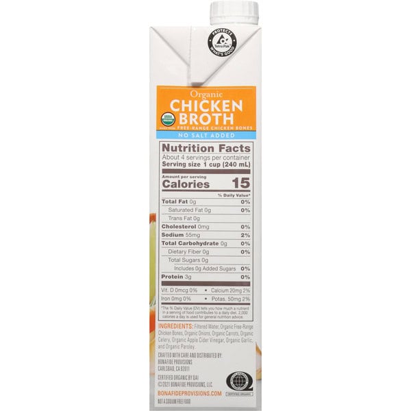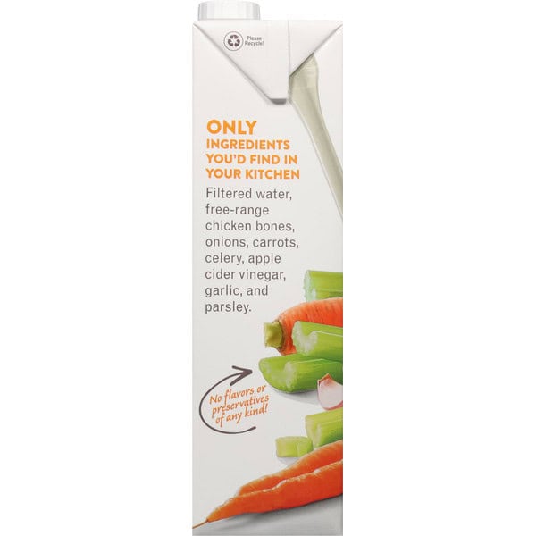 Filtered Water, Organic Free-Range Chicken Bones, Organic Onions, Organic Carrots, Organic Celery, Organic Apple Cider Vinegar, Organic Garlic, and Organic Parsley