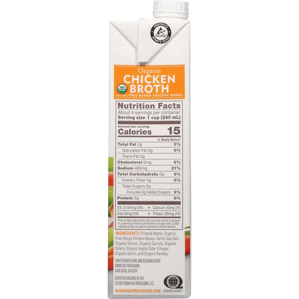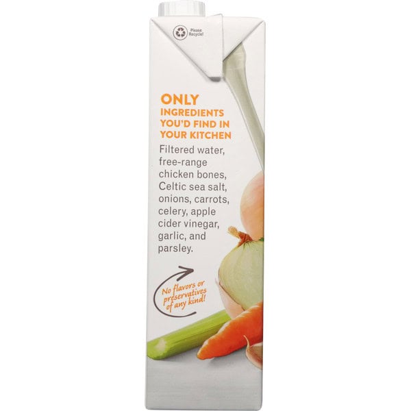 Filtered Water, Organic Free-Range Chicken Bones, Celtic Sea Salt, Organic Onions, Organic Carrots, Organic Celery, Organic Apple Cider Vinegar, Organic Garlic, and Organic Parsley
