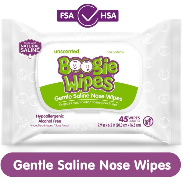 GENTLE SALINE WIPES FOR STUFFY NOSES®: Boogie Wipes® saline nose wipes are wet wipes made with natural saline, which is gentle on skin, helps clean and dissolve snot and boogers, and wipes away dirt and germs. They’re gentle enough to be used on noses, faces, fingers and toes whenever cleaning is necessary.