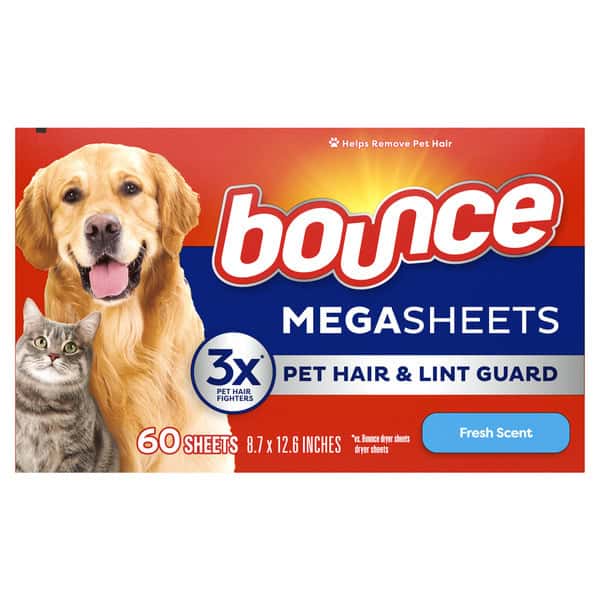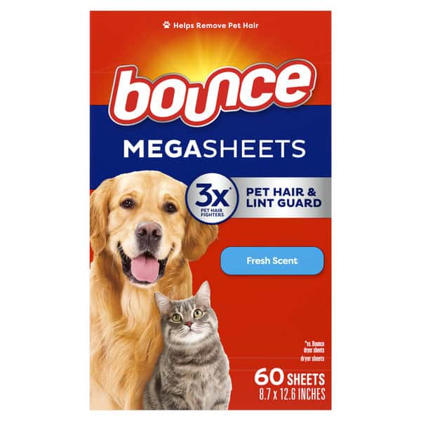 Give your furry friends a hug! Bounce Pet Hair & Lint Guard Mega Sheets dryer sheets repel pet hair from your clothes, before it sticks. One Bounce Mega Sheet has 3x the hair and lint fighting ingredients compared to the leading dryer sheet*.
