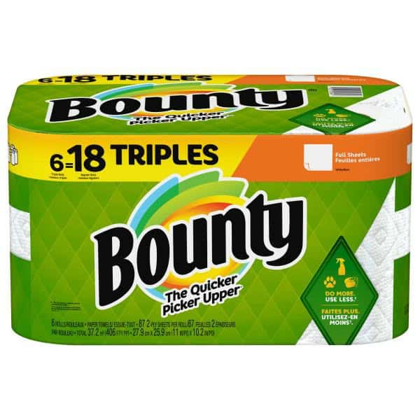 • Pack contains 6 Triple Rolls of white Bounty Full Sheet Paper Towels