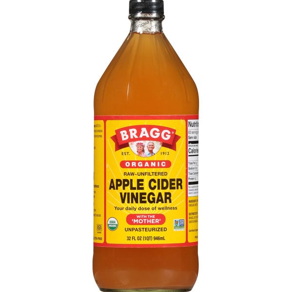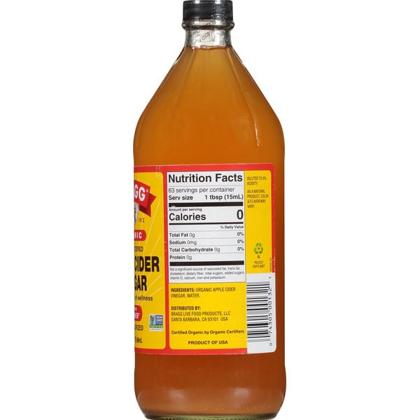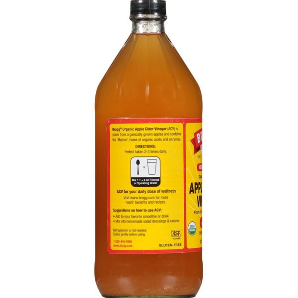 USDA Organic. Certified Organic by Organic Certifiers. Gluten-free. Non GMO Project verified. nongmoproject.org. Est. 192. Raw-unfiltered. Your daily dose of wellness with the mother. Unpasteurized. Bragg Organic Apple Cider Vinegar (ACV) is made from organically grown apples and contains the Mother, home of organic acids and enzymes. ACV for your daily dose of wellness. Diluted to 5% acidity. As a natural product, color & flavor may vary. www.bragg.com. Visit www.bragg.com for more health benefits and recipes. Protect our planet. Product of USA.