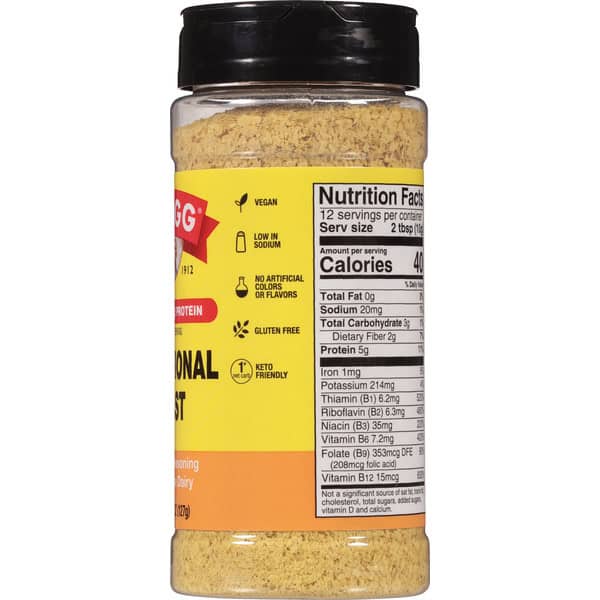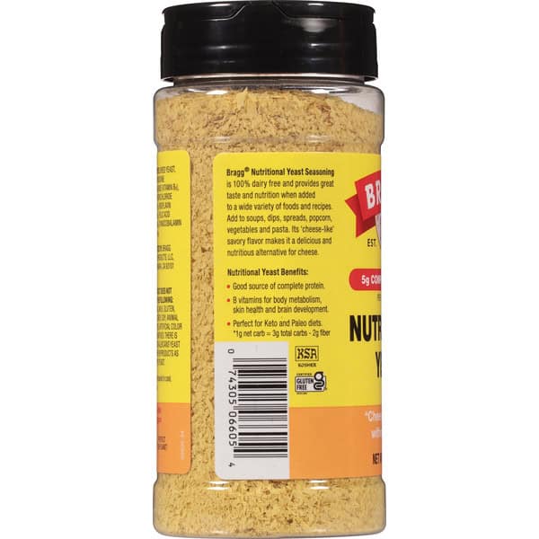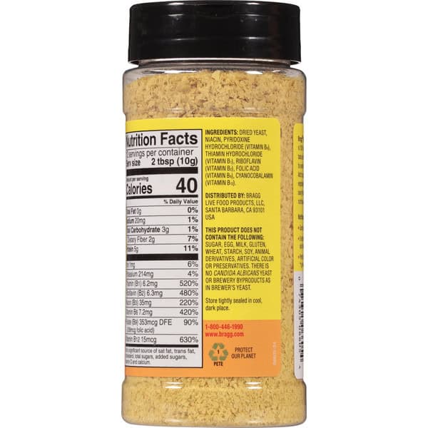 Patricia Bragg N.D. – Ph.D. Pioneer Health Crusader, health educator, author. Paul C. Bragg N.D,. Ph.D – Originator health stores, life extension specialist. 1912-2012. Celebrating 100 years. Shaker top. Sodium free! Delicious flavor added to foods & recipes. Nutritious. Great taste. Vegetarian. Gluten-free. Salt-free. Sugar-free. Serving health worldwide since 1912. Bragg Premium Nutritional Yeast Seasoning is featured ingredient in leading health cookbooks including this Bragg Health Recipe Book. Bragg Vegetarian 700 Health Recipes. Book only $16.95 postpaid to: Health Science Box 7, Santa Barbara, CA 93102 or 800-446-1990 weekdays. This product contains no salt, sugar, no egg, milk, gluten, wheat, corn, no starch, soy, animal derivatives, no artificial colors & preservatives, no Candida albicans yeast or brewery by-products as in brewer’s yeast. Bragg Premium Nutritional Yeast Seasoning provides great-taste and nutrition when added to wide variety of foods and recipes. Makes a healthy, delicious seasoning when sprinkled on most foods, especially: salads, vegetables, potatoes, rice, pasta and even popcorn! Nutritious & delicious. Add to soups, dips, spreads, cereals, juices and smoothies for added flavor and nutrition. Its cheese-like flavor makes it a great no sodium, no cholesterol, delicious, healthy alternative to recipes and most all foods. Specific design to help meet the nutritional needs of vegetarians, vegans and anyone wanting a good source of B-complex vitamins (including natural vitamin B12). 3 John 2. See health recipes – bragg.com.