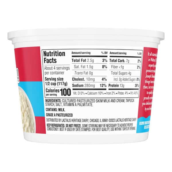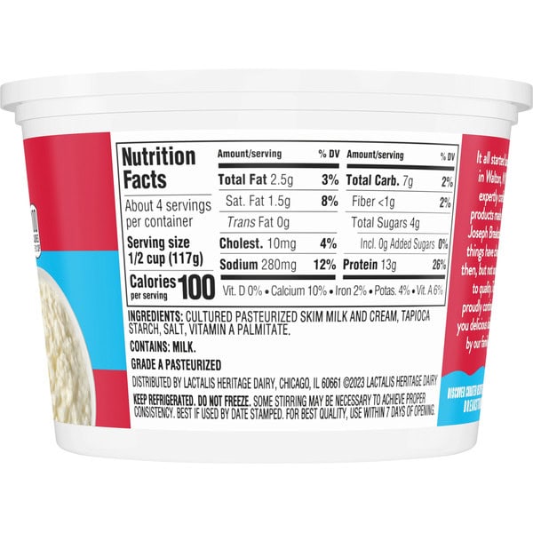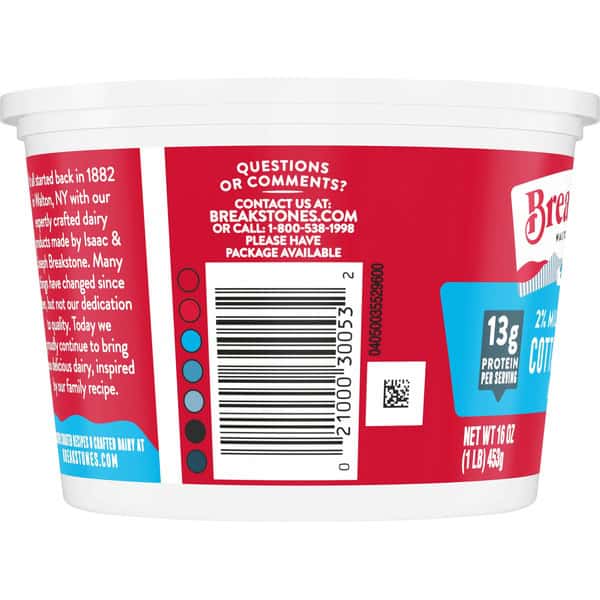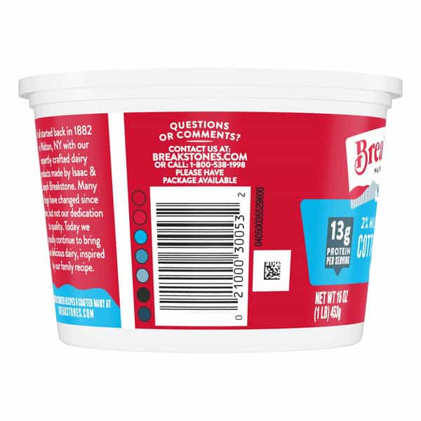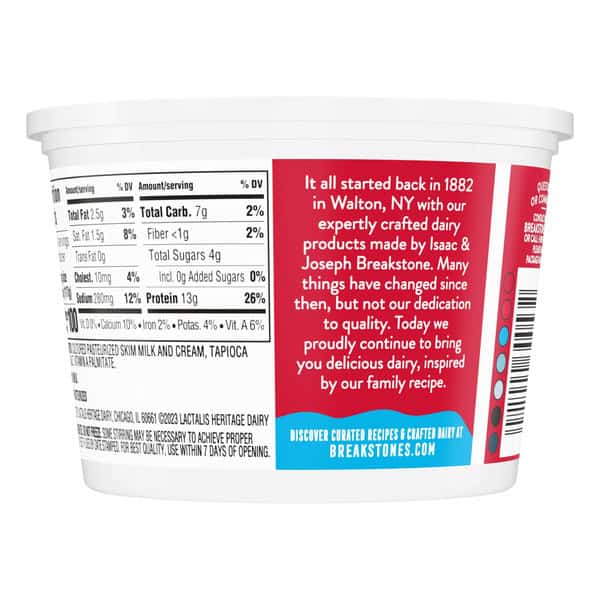 Breakstone’s 2% milkfat low fat large curd cottage cheese is delicious, creamy, and packed with protein. Since it’s origin in 1882 in Walton New York, each cup of Breakstone’s cottage cheese is a celebration of craftsmanship and expertise evident in hand cut curds wrapped in a rich dressing for a fresh and delectable dairy experience. Each serving of Breakstone’s 2% milkfat low fat cottage cheese has 13g of protein and only 100 calories, making it a better choice for your meals. Enjoyed on its own, as a side dish, a protein snack or an ingredient in a variety of lunch or dinner recipes, Breakstone’s cottage cheese is extremely versatile. Explore a variety of breakfast options using Breakstone’s 2% milkfat lowfat cottage cheese as a parfait bowl topped with fruits, on a toast with sweet or savory toppings, or simply blend with fruits or greens for a protein packed smoothie. You can go a step further and use Breakstone’s cottage cheese to make pasta dishes, salads, or even ice cream. Available in a 16oz container, Breakstone’s 2% milkfat low fat cottage cheese can be stored in the fridge and enjoyed for a week once opened, giving you the opportunity to enjoy it in different ways. With over 140 years of heritage, Breakstone’s pays tribute to cultured dairy by bringing delicious high-quality dairy to your home.