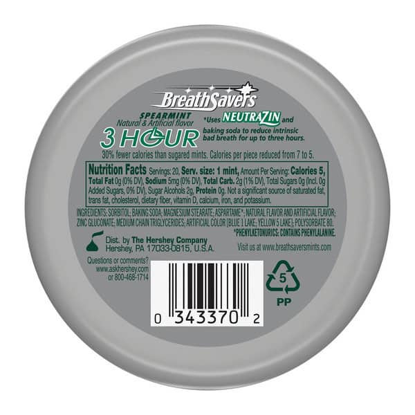 Pop in a 3-hour breath mint when you need a cooling zing of spearmint flavor. Enjoy the confidence of knowing these mints will neutralize your bad breath and rejuvenate your mouth for up to three full hours. BREATH SAVERS 3-hour spearmint flavored breath mints are the perfect minty treat when you need it most — especially after a cup of coffee or a large meal full of garlic and onion! Keep a tin wherever you are for the peace of mind that your breath is always covered. Keep them in your car, desk, pocketbook, backpack, lunch box or briefcase for access to a fast and invigorating minty mouth feeling. Whether you’re giving a presentation, talking with a friend or having guests over for dinner, these BREATH SAVERS 3-hour breath mints will keep you feeling fresh. In the sharing mood? Leave a tin of these sugar free, spearmint flavored BREATH SAVERS treats next to your favorite candy dish for everyone to enjoy along with you. BREATH SAVERS sugar free breath mints are perfect for sharing at the holidays, too. Pop a tin in your Easter baskets and Christmas stockings or offer up a mint to a loved on after a Valentine’s Day or Christmas dinner meal.