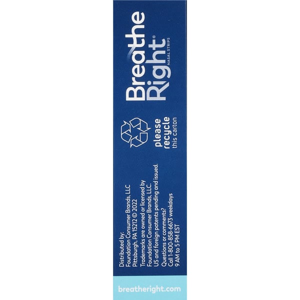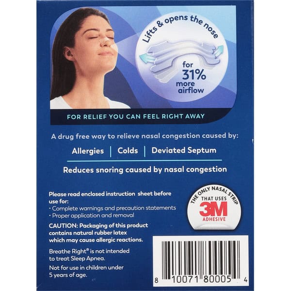 Breathe Right Original Clear Nasal Strips work to instantly open your nose for nasal congestion relief you can feel right away. Breathe Right nasal strips alleviate your nasal congestion, whether from colds, allergies, or a deviated septum, by widening your nostrils, helping you take air in more easily. Each Breathe Right nasal strip is uniquely engineered with flexible “spring-like” bands and sticks to the area right above the flare of each nostril. As the bands attempt to straighten back to their original shape, they gently lift the sides of the nose – instantly opening your nose for immediate relief. Breathe Right Original Clear nasal strips feature a hypoallergenic, flexible, non-porous, clear, material almost unnoticeable to the eye specially made for those with sensitive skin. Additionally, the Original Clear nasal strips can be used anytime, anywhere: as your go-to snoring strips, offering snoring relief, or being great to use during exercise, allowing for better breathing while working out or playing sports. It stays put, no matter the activity. Breathe Right is safe for adults and children over the age of 5 and our Original nasal strips come in small/medium and large sizes for the perfect fit. Breathe Right nasal strips may be used daily. Do not use for more than 12 hours per day. If rash or skin irritation occurs, discontinue use. Each strip is for single use only – do not reapply; use a fresh strip. Each nasal strip is individually sealed in its own wrapper for ease of use. Caution: Packaging of the product contains natural rubber latex which may cause allergic reactions.