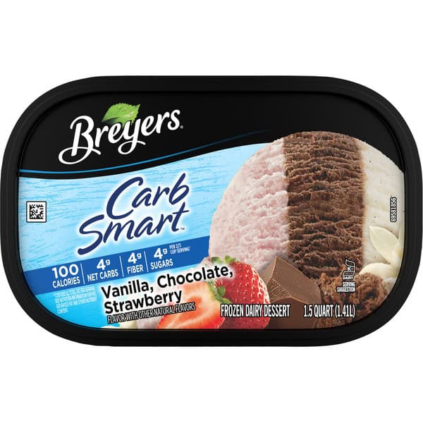 Breyers CarbSmart Vanilla Chocolate Strawberry is a satisfying-frozen dairy dessert with only 4g net carbs and 4g of sugar per serving. Ice cream is delicious, but if you’re watching your sugars and carbs, it may not be such a sweet deal. With Breyers CarbSmart frozen dessert, you don’t have to sacrifice taste and quality to enjoy a carb-conscious frozen treat. Your sweet tooth can indulge in smooth, creamy vanilla, chocolate and strawberry without the guilt. Back in 1866, when our founder William Breyer started his small ice cream operation in Philadelphia, he was watching over the quality of the ingredients that he put into his ice cream. And that’s what we still do today. Our Breyers CarbSmart Vanilla Chocolate Strawberry abides by our Pledge to use 100% Grade A milk and fresh cream from American cows not treated with artificial growth hormones*. If you’re looking for other carb-conscious options, try our delicious CarbSmart Brownie a la Mode or our novelty bars in Almond, Fudge, Vanilla, and Mint Fudge! * The FDA states that no significant difference has been shown between dairy derived from rBST-treated and non-rBST-treated cows. +NET CARBS ARE CALCULATED BY SUBTRACTING TOTAL DIETARY FIBER AND SUGAR ALCOHOL FROM TOTAL CARBOHYDRATES