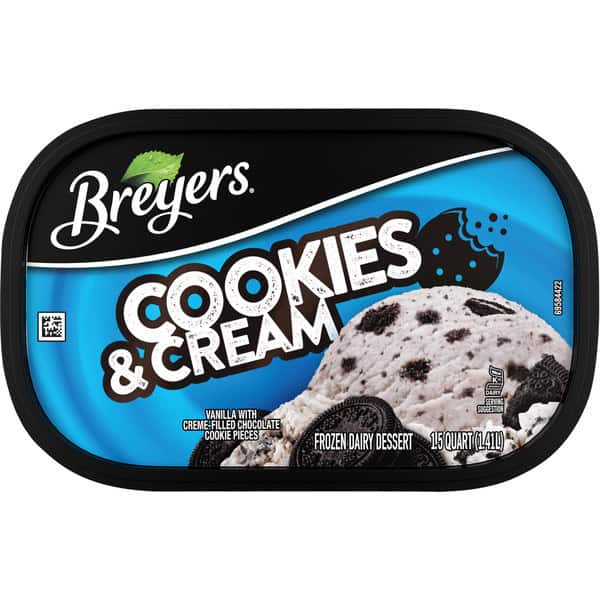 • Breyers Cookies and Cream Frozen Dairy Dessert is made with fresh, cream, sugar, and loaded with crème-filled chocolate cookie pieces