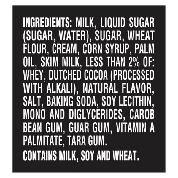Milk, Liquid Sugar (sugar, Water), Sugar, Wheat Flour, Cream, Corn Syrup, Palm Oil, Skim Milk, Less Than 2% Of: Whey, Dutched Cocoa (processed With Alkali), Natural Flavor, Salt, Baking Soda, Soy Lecithin, Mono And Diglycerides, Carob Bean Gum, Guar Gum, Vitamin A Palmitate, Tara Gum