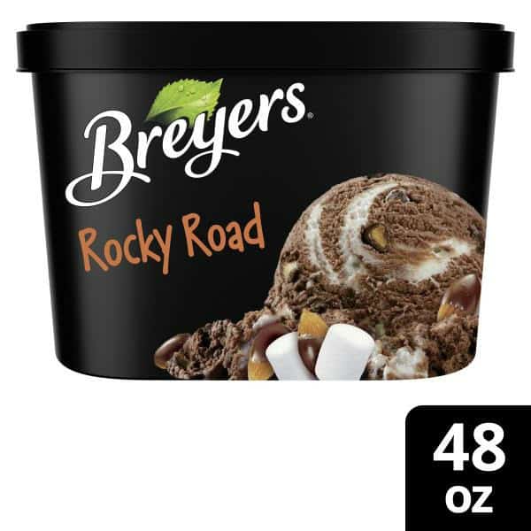 Deliciously gooey marshmallow swirled through rich chocolate Breyers and real almond pieces. Breyers Rocky Road is the fastest road to fun! Love Breyers chocolate ice cream as a frozen dessert? Well, this frozen dairy dessert, made with rich cocoa, will be sure to be your new favorite. Our philosophy is to start with the high-quality ingredients to make great-tasting ice cream and frozen dairy desserts. In our Breyers Rocky Road frozen treat, we start with 100% Grade A milk and cream from American cows not treated with artificial growth hormones*, colors and flavors from natural sources**, and sustainably farmed fruit and vanilla.