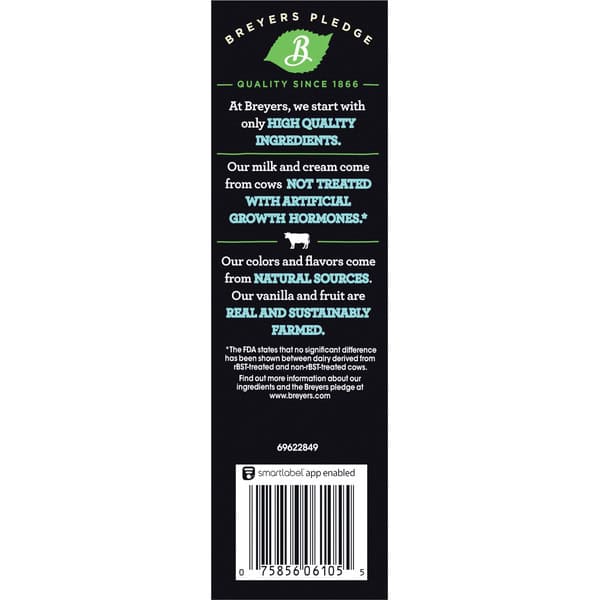 • Breyers uses high-quality ingredients in all of our ice cream and frozen dairy desserts, like partnering with American Farmers for 100% Grade A milk and cream