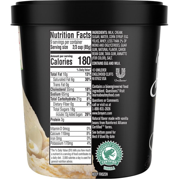 • Breyers uses the highest-quality ingredients in all of our ice cream recipes, like sustainable vanilla from Rainforest Alliance farms and 100% Grade A milk and cream