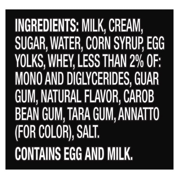 Milk, Cream, Sugar, Corn Syrup, Egg Yolks, Whey, Vegetable Gums (carob Bean, Tara, Guar), Mono And Diglycerides, Natural Flavors, Annatto (for Color), Salt.