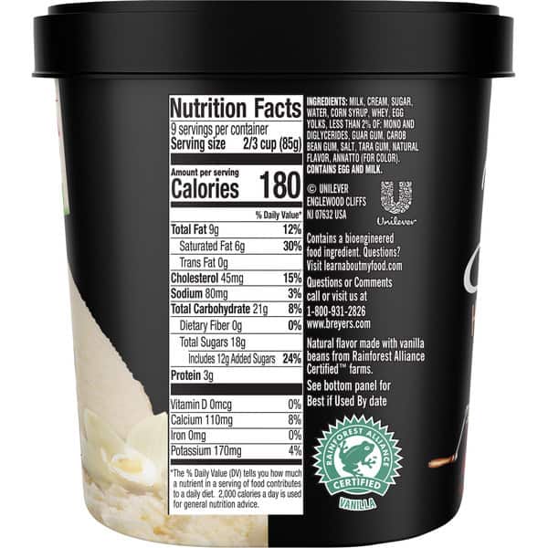 • Breyers uses the highest-quality ingredients in all of our ice cream recipes, like sustainable vanilla that is Rainforest Alliance Certified and 100% Grade A milk and cream