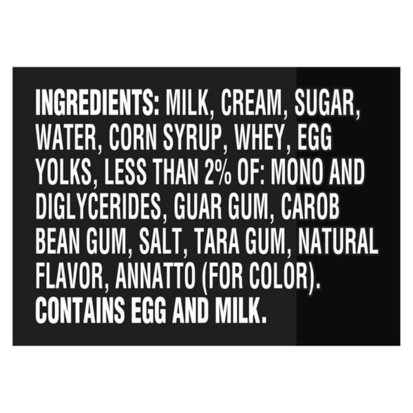 Milk, Cream, Sugar, Corn Syrup, Whey, Egg Yolks, Carob Bean Gum, Mono And Diglycerides, Salt, Natural Flavor, Vanilla Extract*, Annatto (for Color), Guar Gum, Tara Gum.