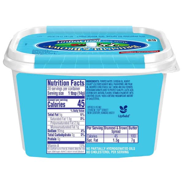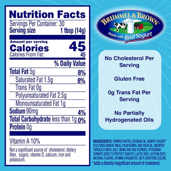 Enjoy the sweet, creamy taste of Brummel & Brown buttery spread, made with a delicious blend of plant-based oils and the wholesome goodness of real yogurt.