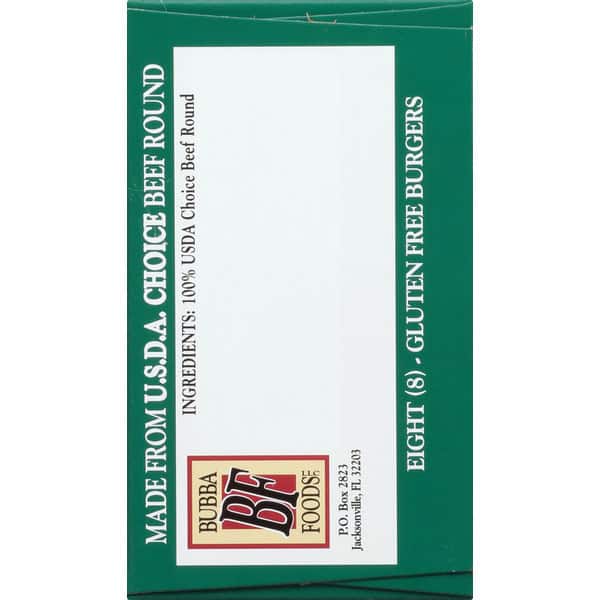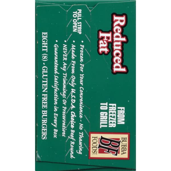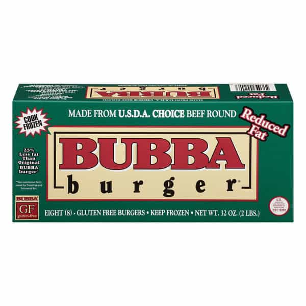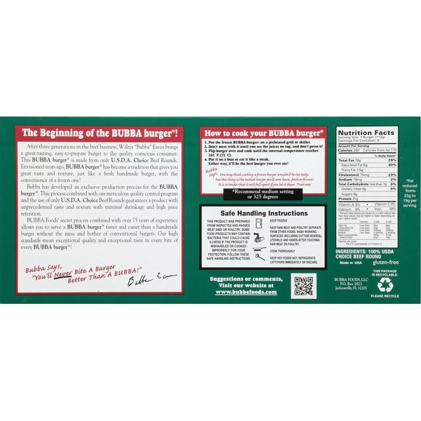 Made from U.S.D.A. choice beef round. Gluten-free. Reduced fat. 25% less fat than Original Bubba burger (See nutritional facts panel for total fat and saturated fat) (Fat reduced from 25 g to 19 g per serving). From freezer to grill. The Beginning of the Bubba Burger! After three generations in the beef business, Walter Bubba Eaves brings a great-tasting easy-to-prepare burger to the quality conscious consumer. This Bubba burger is made from only U.S.D.A. beef rounds and delicious sweet onions making this burger so good you will never want to slice an onion again! Envisioned years ago, Bubba burger has become a tradition that gives you great taste and texture, just like a fresh handmade burger, with the convenience of a frozen one! Bubba has developed an exclusive production process for Bubba burger. This process combined with a meticulous quality control program and the use of only U.S.D.A. beef rounds guarantees a product with unprecedented taste and texture with minimal shrinkage and high juice retention. Bubba Foods’ secret process combined with over 75 years of experience allows you to serve a Bubba burger faster and easier than a handmade burger without the mess and bother of conventional burgers. Our high standards mean exceptional quality and exceptional taste in every bite of every Bubba Burger. Bubba says, you’ll never bite a burger better than a Bubba. – Bubba Eaves. Made from only U.S.D.A. choice beef round. Never any trimmings or preservatives. Guaranteed satisfaction in every box. U.S. inspected and passed by Department of Agriculture. Est. 19292. www.bubbafoods.com. Suggestions or comments, visit our website ay www.bubbafoods.com. Be Sure To Try Our Other Delicious Bubba Burger Varieties: Original. Bubba Angus beef. All natural turkey. Jalapeno. Look or Bubba grillers family of products! This package is recyclable. Please recycle. Made in USA.